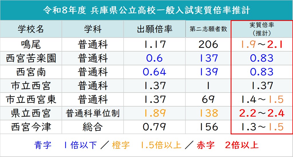 まずは一覧から。西宮市内7校の「実質倍率推計」はこちら