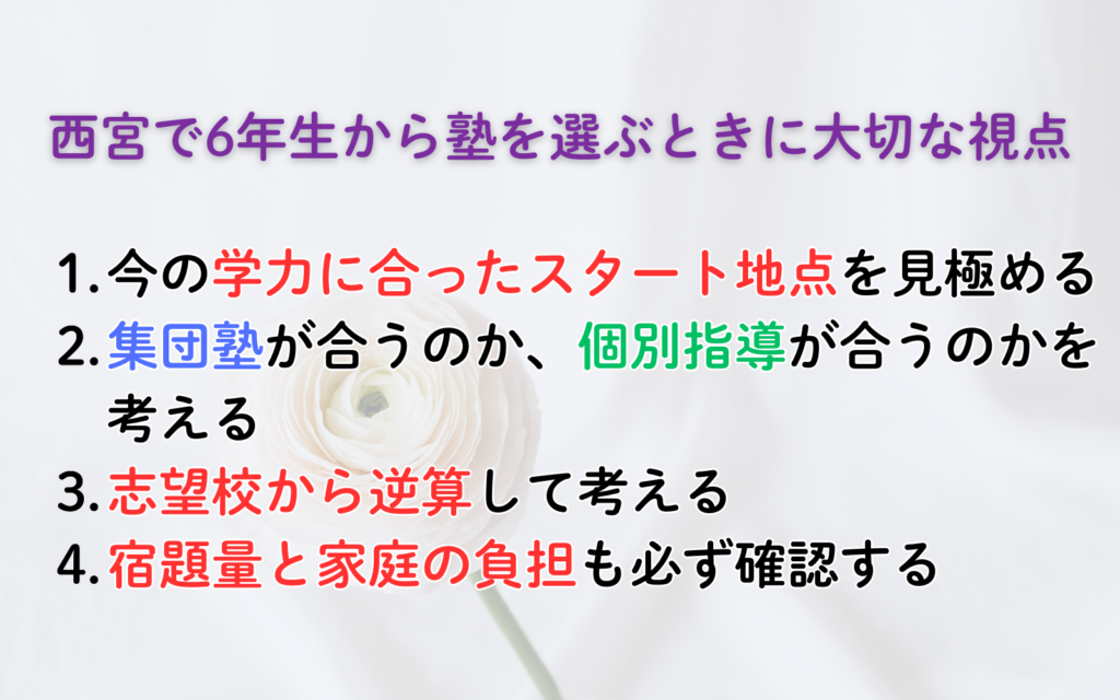この記事では、【西宮・中学受験・塾】というテーマで、塾選びに迷ったときの考え方と、6年生からでも可能性を広げるための見極めポイントをわかりやすくお伝えします。