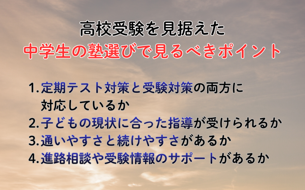 西宮で高校受験を見据えた塾選びをする際には、次のポイントを確認しておくことをおすすめします。