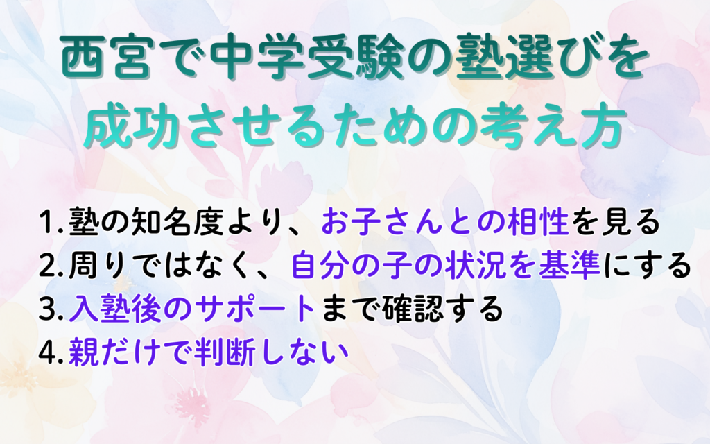 西宮の中学受験塾を選ぶ際は、「有名かどうか」ではなく、今のお子さんが無理なく続けられるか、力を伸ばせるかという視点が欠かせません。