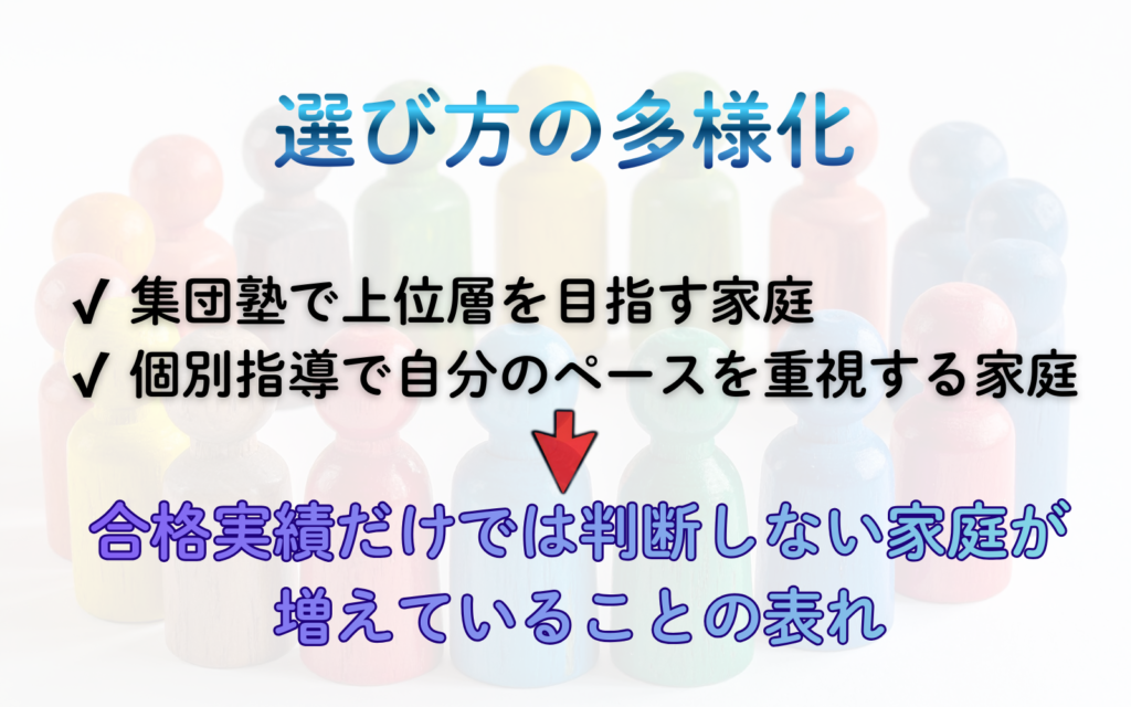 最近では個別指導型の塾を選ぶ家庭が明らかに増えているという変化が見られます。