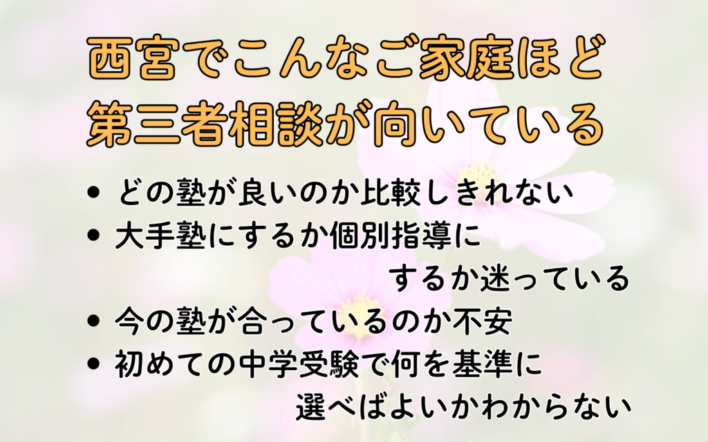 西宮で中学受験を考えているご家庭こそ、一度第三者の視点を入れながら、落ち着いて塾選びを進めてみてはいかがでしょうか。