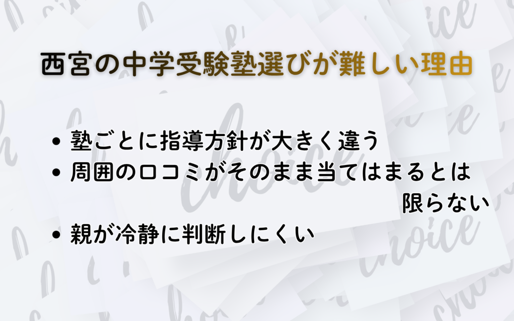 しかし、西宮は中学受験向けの塾の選択肢が多い地域だからこそ、次のような難しさがあります。